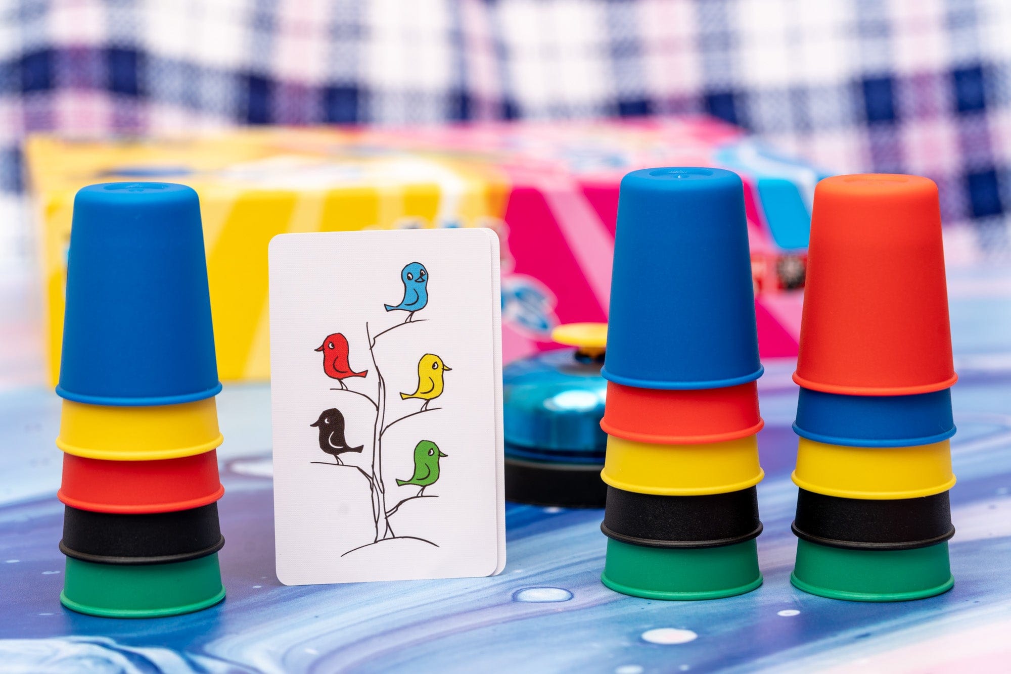 Žaidėjai varžosi dėliodami spalvotus puodelius pagal kortelių nurodymus – greitis ir tikslumas svarbiausi!