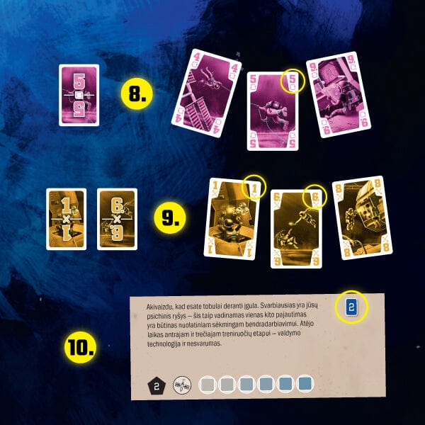 8. Užduotis laikoma baigta, kai žaidėjas paima kirtį su užduoties korta. 9. Per vieną raundą galite atlikti kelias užduotis. 10. Misija laikoma atlikta, kai visos užduotys yra baigtos. Misijos neįvykdote, jei jums pasibaigia ėjimai ar kažkas kitas atlieka jūsų užduotį.