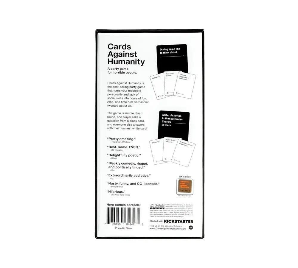 „Kortos prieš žmoniją“ yra negražus, siaubingai smagiai negražus vakarėlių žaidimas. Raundo vadovas perskaito klausimą iš juodųjų kortelių, o visi kiti bando priversti nusišpysoti ar kitaip nustebinti lyderį savo atsakymais į baltąsias korteles.