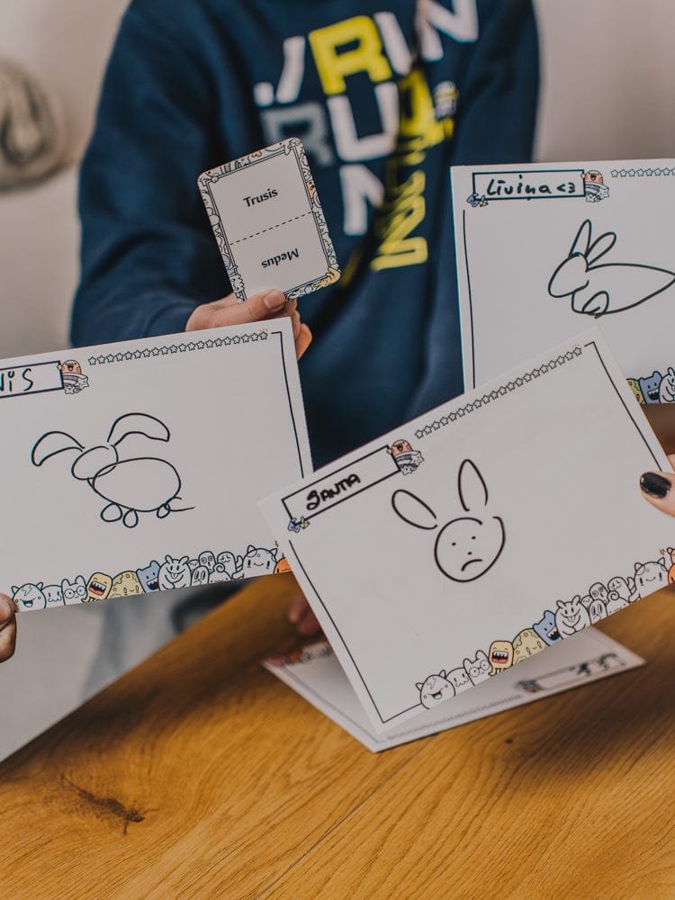 Vaikai piešia, spėja ir juokiasi, kai piešiniai išeina visai ne taip, kaip tikėtasi – linksmybės garantuotos! -