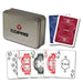 Rinkinį sudaro stilinga metalinė dežutė bei viena raudona ir viena mėlyna kortų kaladė.