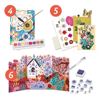 Šešios skirtingos veiklos viename rinkinyje - gėlių sukūrimas, piešimas ir antspaudai, 3D paveikslėliai, koliažai, brėžimo menas bei tapyba. Rinkinyje yra visi reikalingi popieriai, lipdukai, formos, fonai, spalvos, antspaudai ir įrankiai, skirti sukurti šiuos skirtingus rankdarbius.