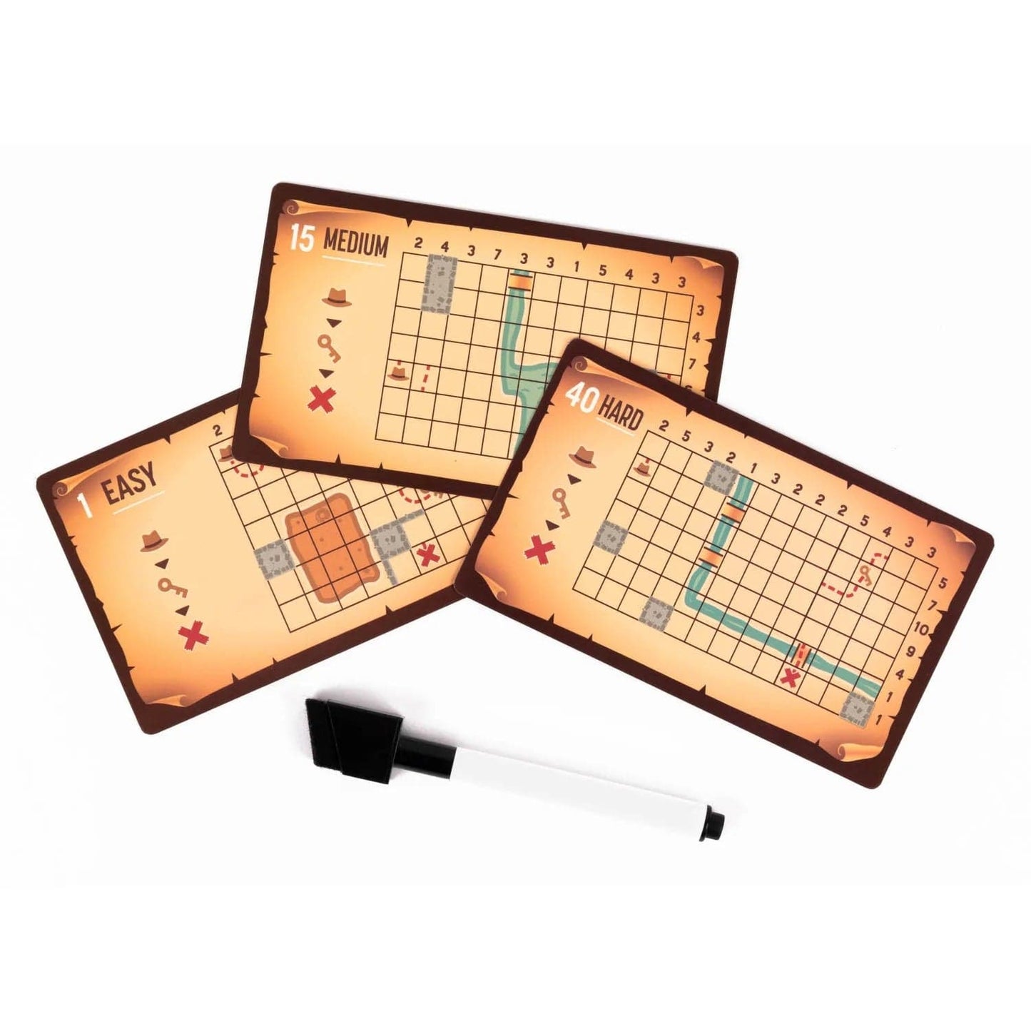 Pasiruoškite nuotykiams su šiais veiksmo kupinais loginiais galvosūkiais! Šios daugkartinio naudojimo kortelės puikiai tinka bet kokio amžiaus žmonėms.