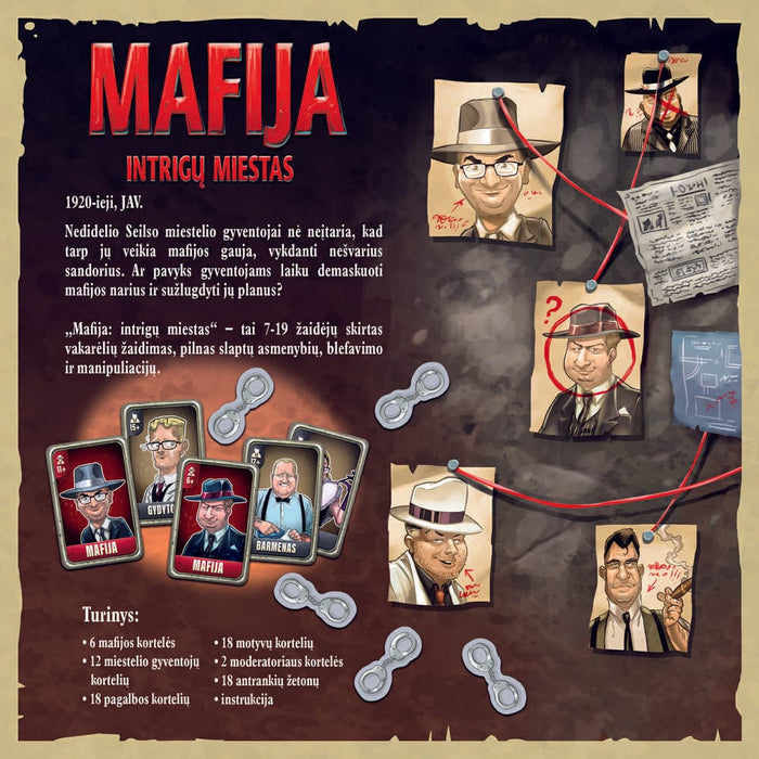 1920-ieji, JAV. Nedidelio Seilso miestelio gyventojai nė neįtaria, kad tarp jų veikia mafijos gauja, vykdanti nešvarius sandorius. Ar pavyks gyventojams laiku demaskuoti mafijos narius ir sužlugdyti jų planus? „Mafija: intrigų miestas“ – tai 7-19 žaidėjų skirtas vakarėlių žaidimas, pilnas slaptų asmenybių, blefavimo ir manipuliacijų.