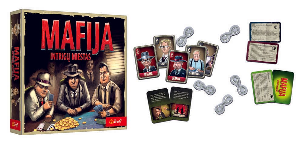 Žaidime yra: 6 mafijos kortelės, 12 miestelio gyventojų kortelių, 18 pagalbos kortelių, 18 motyvų kortelių, 2 moderatoriaus kortelės, 18 antrankių žetonų, instrukcija.