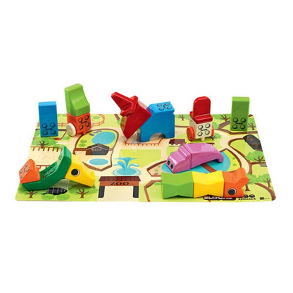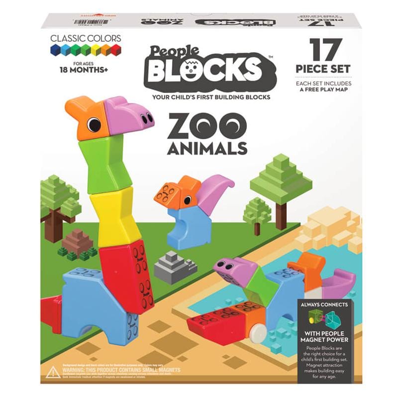 Rinkinį sudaro 17 gyvūnų įkvėptų formų ir žaidimo žemėlapis. Lengvai kombinuojamas su kitais People Blocks magnetinių kaladėlių rinkiniais.