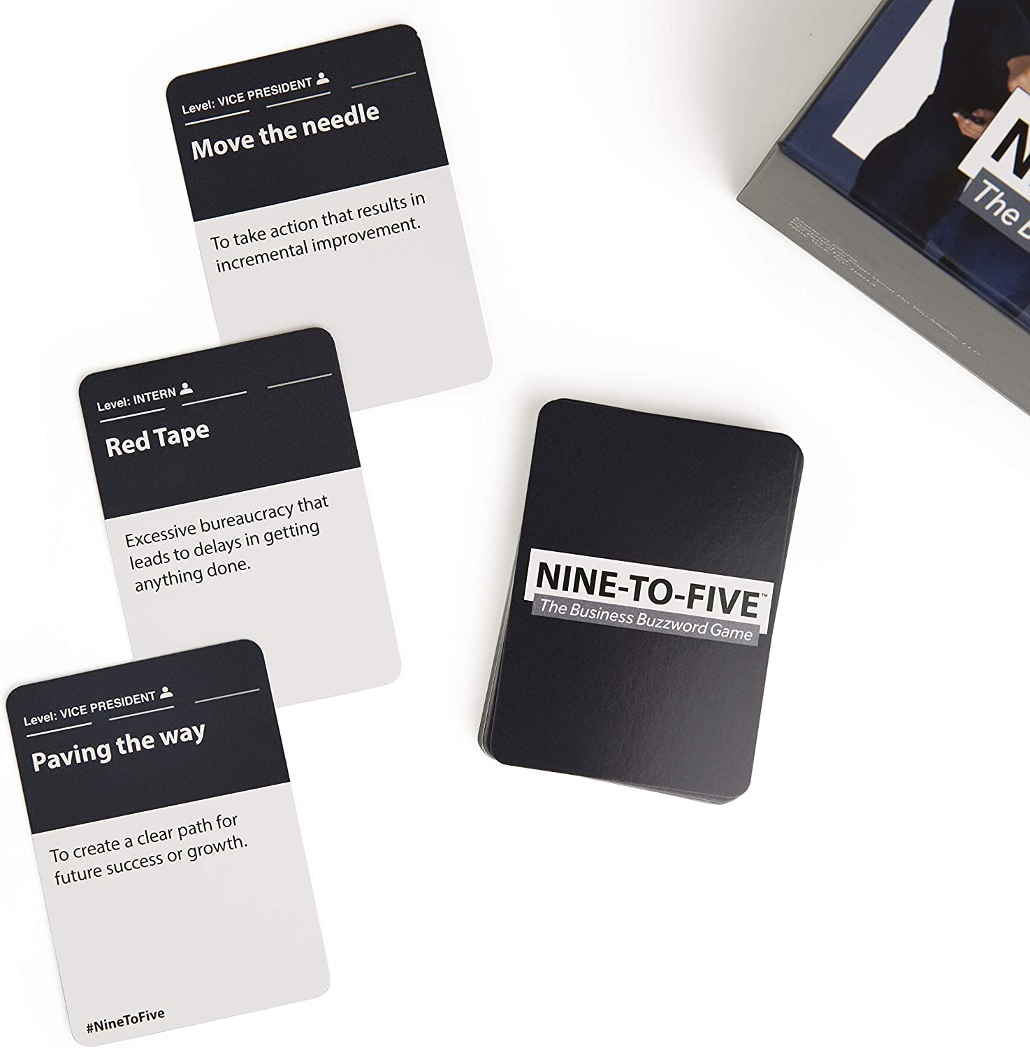 „Nine-to-Five“ yra „What Do You Meme“ kūrėjų sukurtas biuro kortų žaidimas, kuriame jūs konkuruojate su bendradarbiais, kad sužinotumėte, kas per dieną gali naudoti daugiausiai populiariausių verslo frazių.