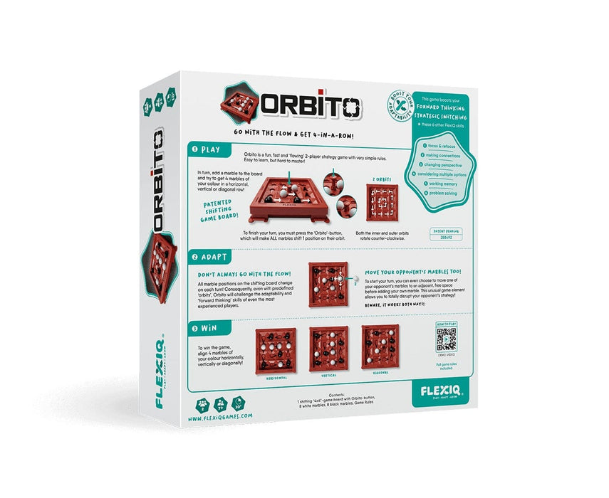 Pabandykite išgauti keturis savo spalvos rutuliukus horizontalioje, vertikalioje arba įstrižoje eilėje ant patentuotos, besikeičiančios žaidimų lentos. Bet saugokis! Norėdami baigti savo eilę, turite paspausti mygtuką „Orbito“, kuris privers VISUS rutuliukus pasislinkti 1 padėtimi savo orbitoje!