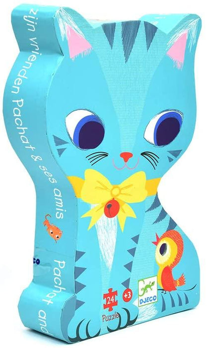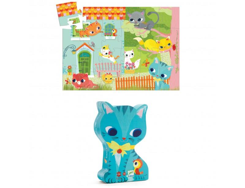 Djeco dėlionė supakuota unikalioje katės formos dėžutėje.