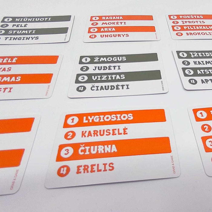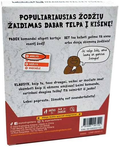 Žaidimas ir jo humoras puikiai tiks tiek vakarėliams su draugais, tiek stalo žaidimų vakarui su visa šeima. Vaikai greitai perpranta paprastas taisykles, sugalvoja pačių keisčiausių ir kūrybiškiausių apibūdinimų.Žaidime rasite 60 dvipusių kortelių ir net 480 skirtingų žodžių linksmai pramogai!