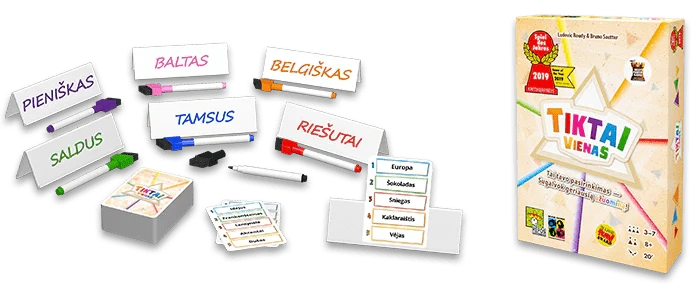 Sugalvokite geriausias užuominas komandos draugui ir būkite originalūs, nes vienodos užuominos bus panaikintos!Prestižinį geriausio 2019 m. metų stalo žaidimo apdovanojimą (Spiel des Jahres) pelnęs žaidimas patiks Alias mėgėjams ir visiems, kam patinka šaradų ir užuominų žaidimai. Į komplektą įeina 7 spalvoti nuvalomi flomasteriai.