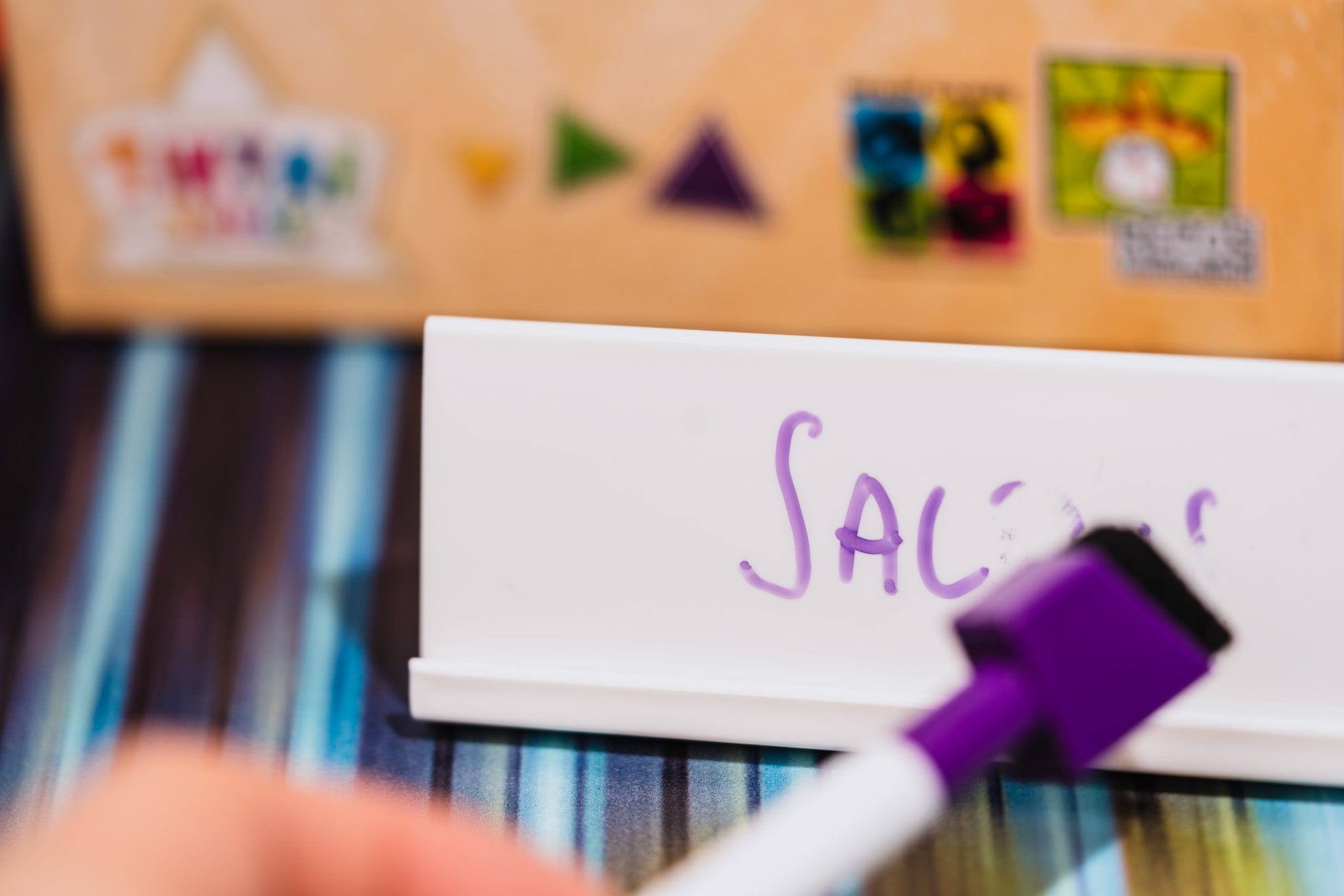 Kiti žaidėjai mato žodį ir turi slapta parašyti užuominą ant savo stovelio. -