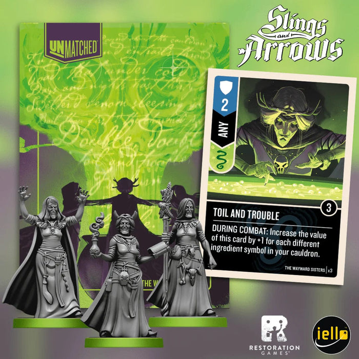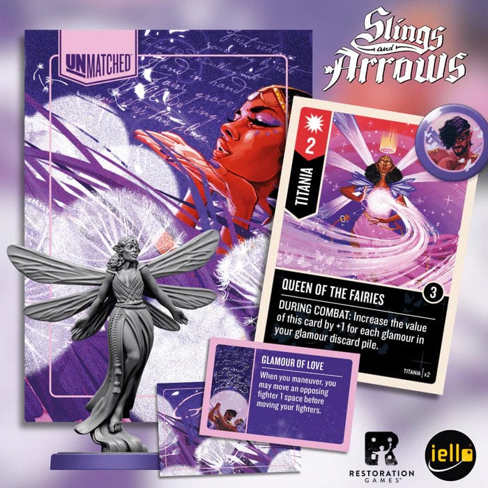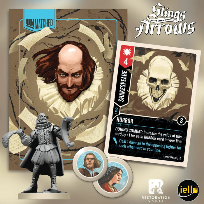 The Pen is Mightier Than the Sword! All the world’s a stage… but the Globe is a battlefield. Slings and Arrows brings Shakespeare to the fight along with three of his wondrous characters: The Wayward Sisters, Hamlet, and Titania. How does the Bard of Avon and his creations fare in the best-selling game of tactical combat between unlikely opponents? The play’s the thing…